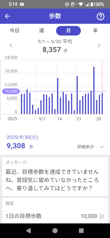 新しい機種、どうやって歩数をカウントしているのかわかりませんが、ジャイロは使われていません。なんと家の中ではカウントされないのです。GPSで距離で割り算しているものと思われ、、、これって、歩いてるかどうやってカウントするんだろう、、、まぁ目安だからいいんですけどね。というわけで、前のケータイのときは、ランニングだけぴょんととびあがることはなかったんです。とりあえず走る距離を増やしたわけではありません。